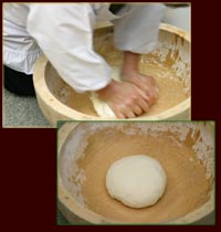 ![]() | こねる ぼそぼそしてきたところで、だんだん力を込めながら丸くまとめていきます。なかなか力のいる作業ですが長年の経験から得たコツがあるから おばあちゃんの細腕でもちゃんとコシのある麺ができるのです。 |